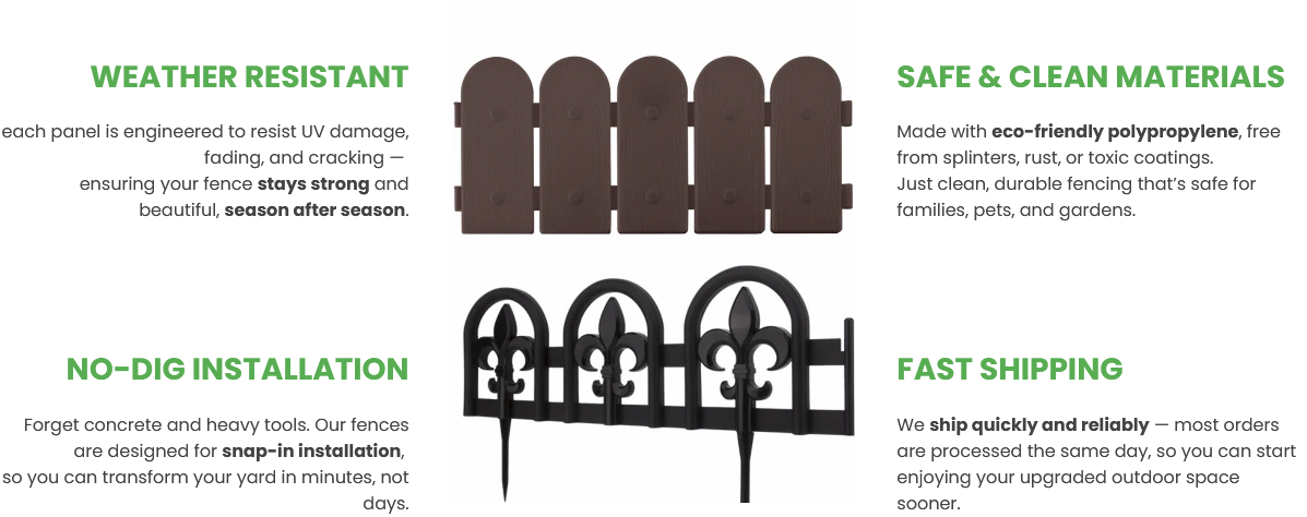 Evelyne Collection is here to give you a stunning, long-lasting fence that installs in minutes — no digging, no stress.